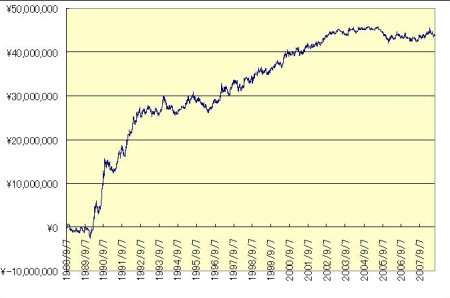 以下の図をご覧いただいてもわかるとおり、2003年くらいまでは、ほぼ一方的に資産が右肩上がりとなっており、日経225先物の上場時から2002年の末までに毎日1枚売っているだけで、4400万円以上の利益が得られたのです。