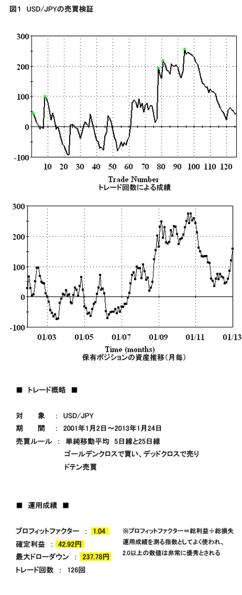 まず、右の図1を見て下さい。USD/JPYを対象に過去10年間、単純移動平均を使った売買の資産推移です。5日線と25日線のGC(ゴールデンクロス)で買い、DC(デッドクロス)で売りという至ってシンプルなやり方です。しかし、このやり方では10年間の運用で、資産が増えるどころか、数年で破産していることがわかります。